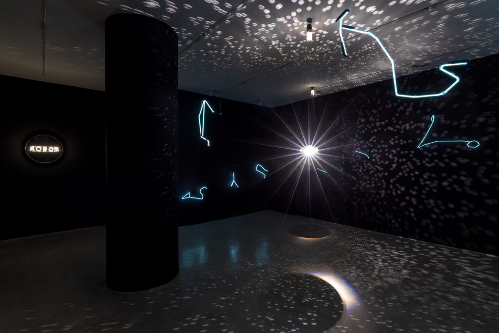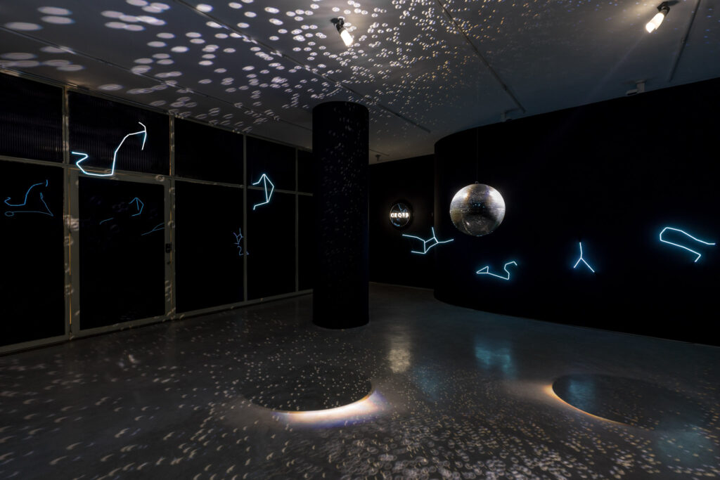 No centro da mostra, a instalação Solaris Discotecum (2023) organiza o espaço como um sistema orbital, no qual constelações do zodíaco e elementos luminosos se relacionam em movimento contínuo. A presença de materiais como o argônio, associado à formação de estrelas, reforça a dimensão física e simbólica da exposição, aproximando o visitante de uma matéria que remete à origem do cosmos.
