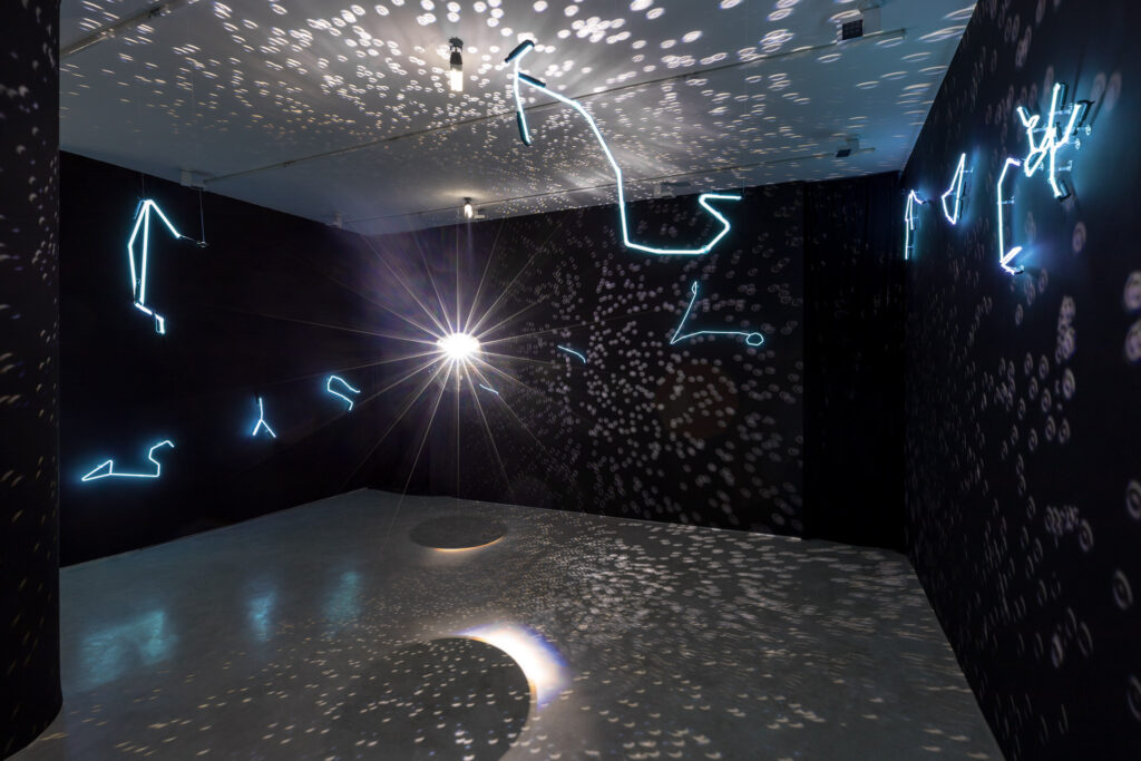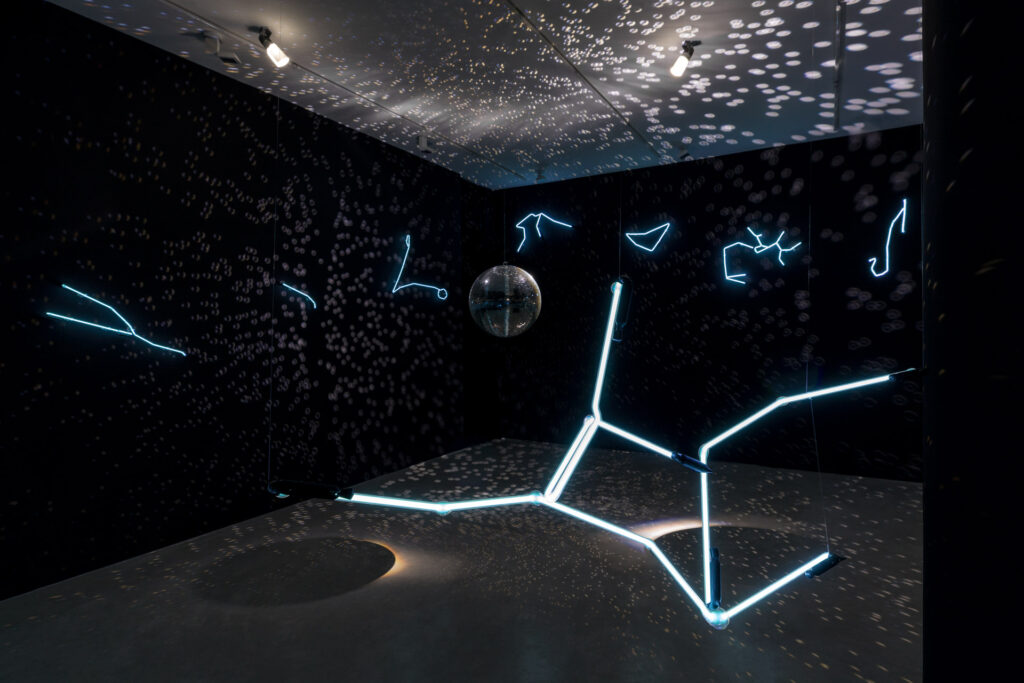 Assim, Solaris Discotecum (2023) apresenta em néon uma série de abstrações geométricas das conexões possíveis entre as estrelas relacionadas a cada constelação do zodíaco. Cada mapa apresenta sua própria interpretação sobre como cada estrela se conecta para formar um desenho que viria a ser interpretado como um caranguejo ou uma balança, um leão ou um caprino. Foram consultadas dezenas de cartografias a fim de encontrar as semelhanças e diferenças entre elas. Alguma decisões visuais e compositivas, outras da ordem da tradução e adaptação de uma para outra. Mas em todos, a inquietação de entender como tantos povos inferiram imagens tão complexas a partir de abstrações simples de linhas e pontos no céu.